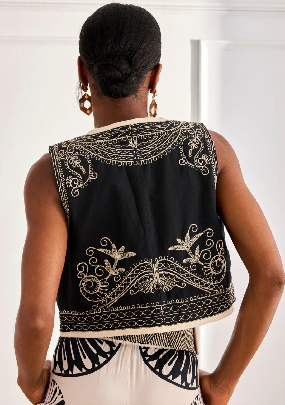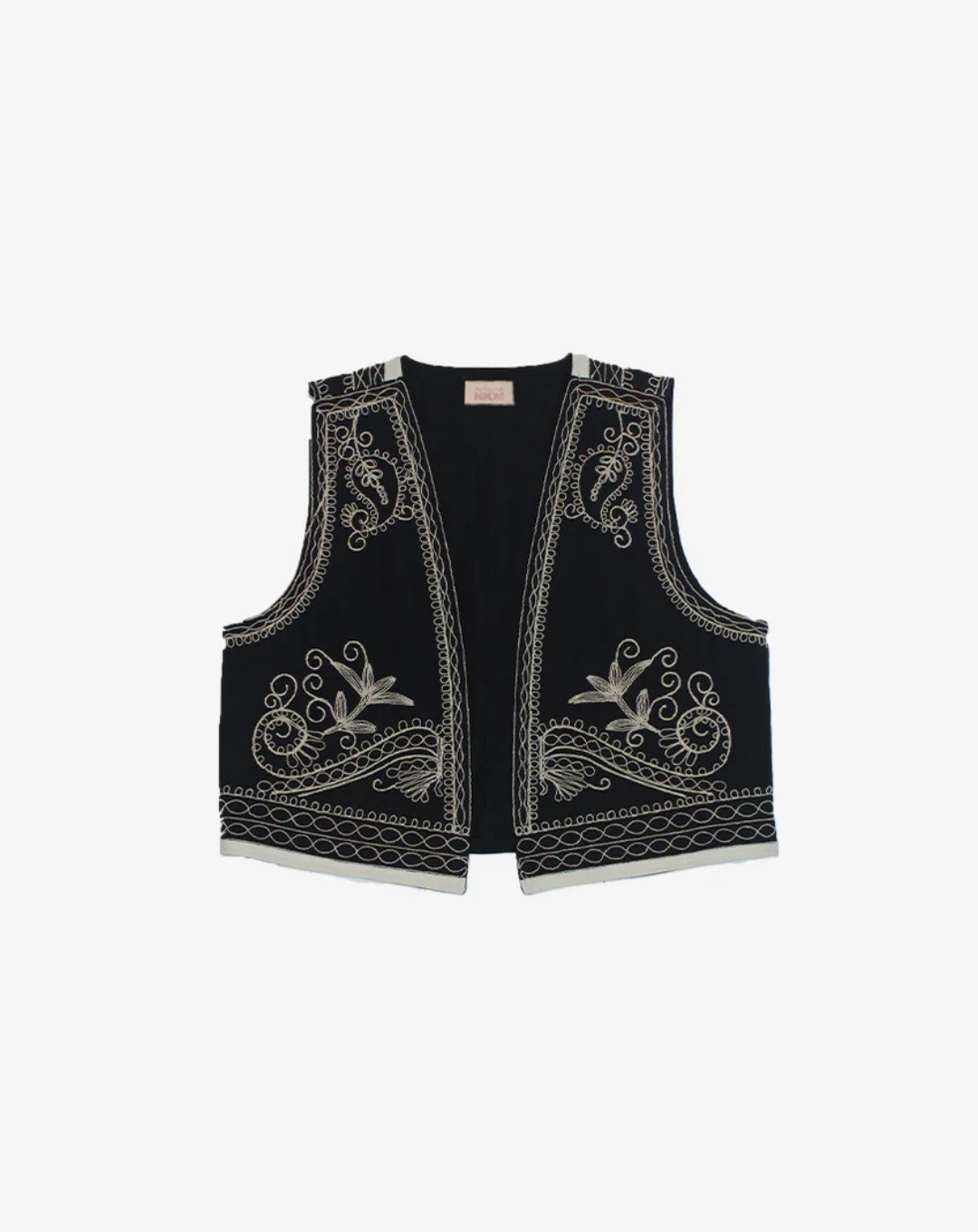 Chaleco corto con detalles paisley y florales bordados en contraste de color. Detalle de ribete en contraste de color en el bajo. Sin cierre.