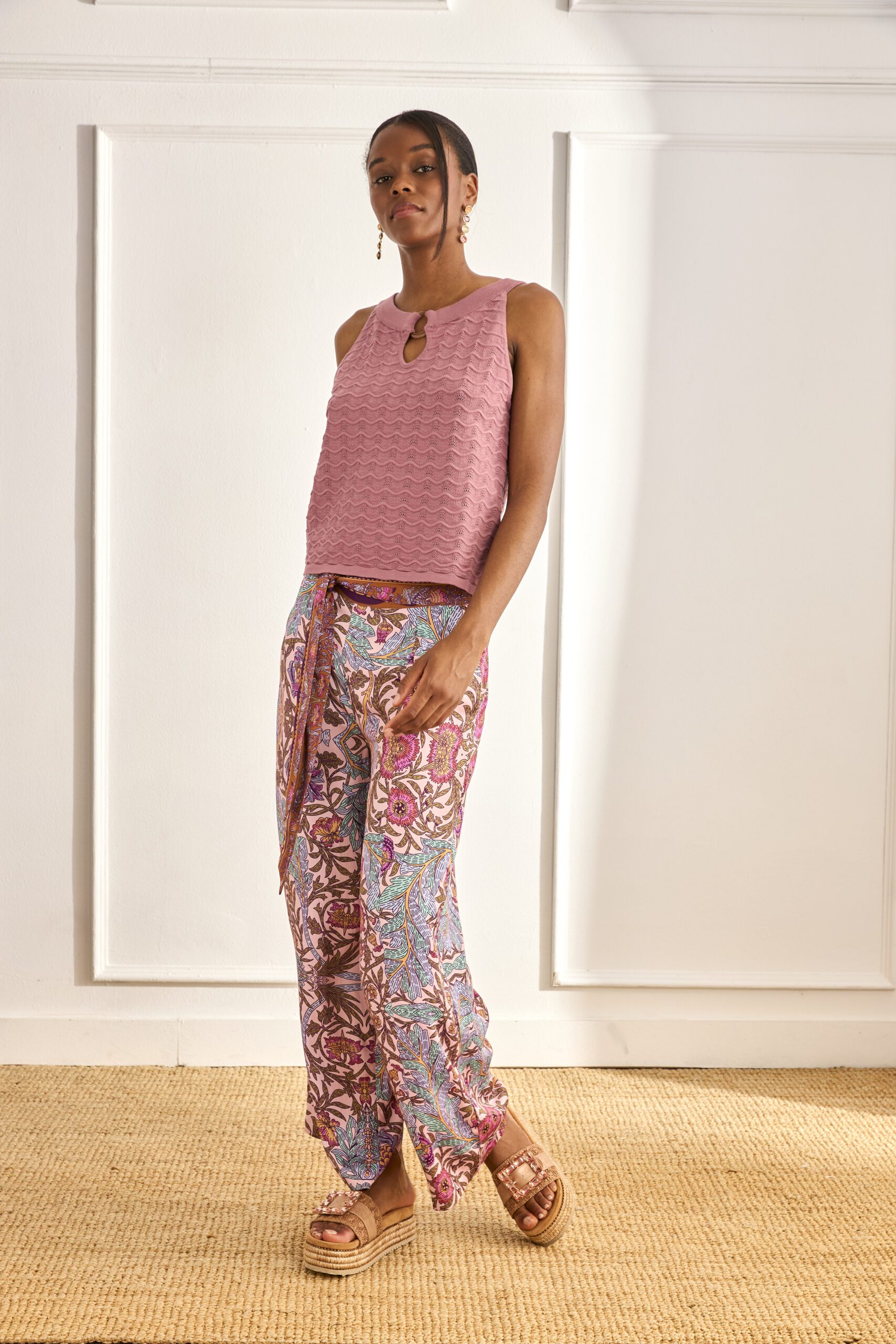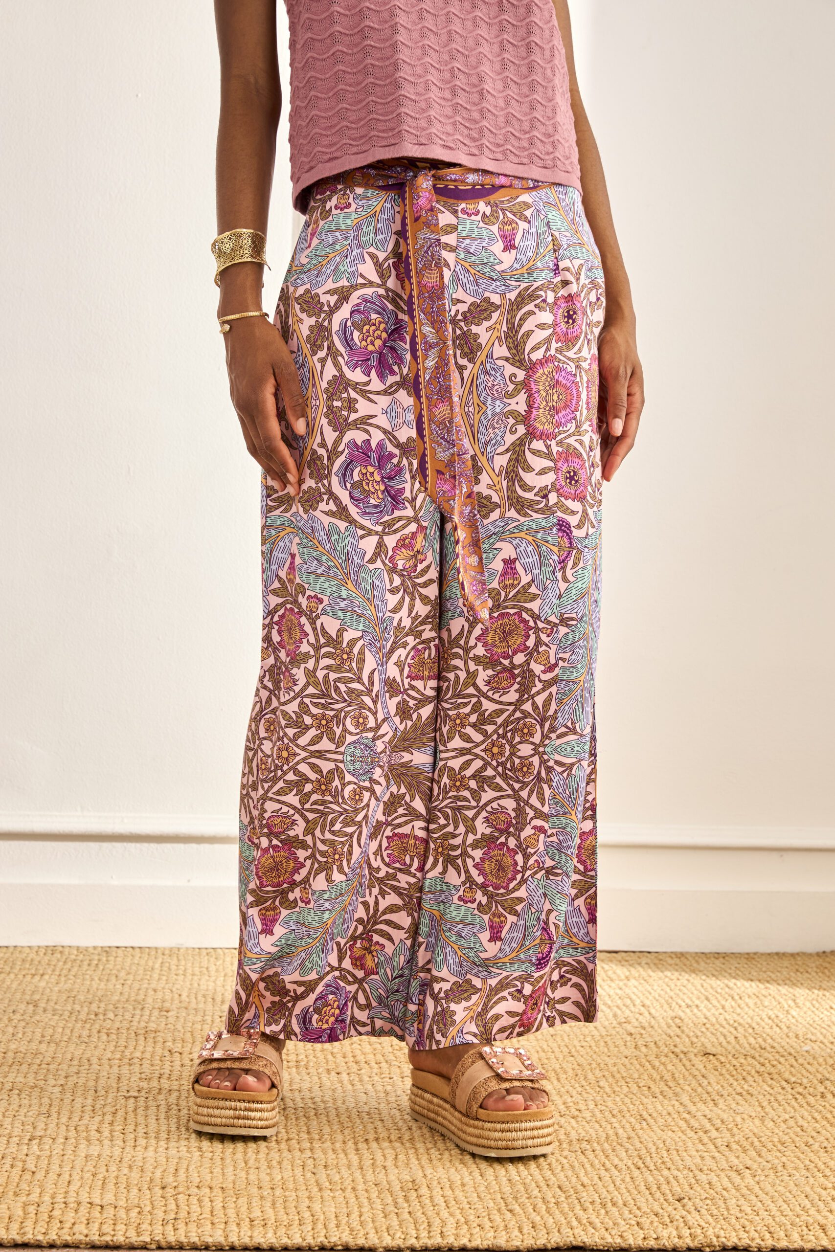 Pantalón largo con estampado floral multicolor. Cintura con franja en contraste y lazada para anudar. Bolsillos laterales.