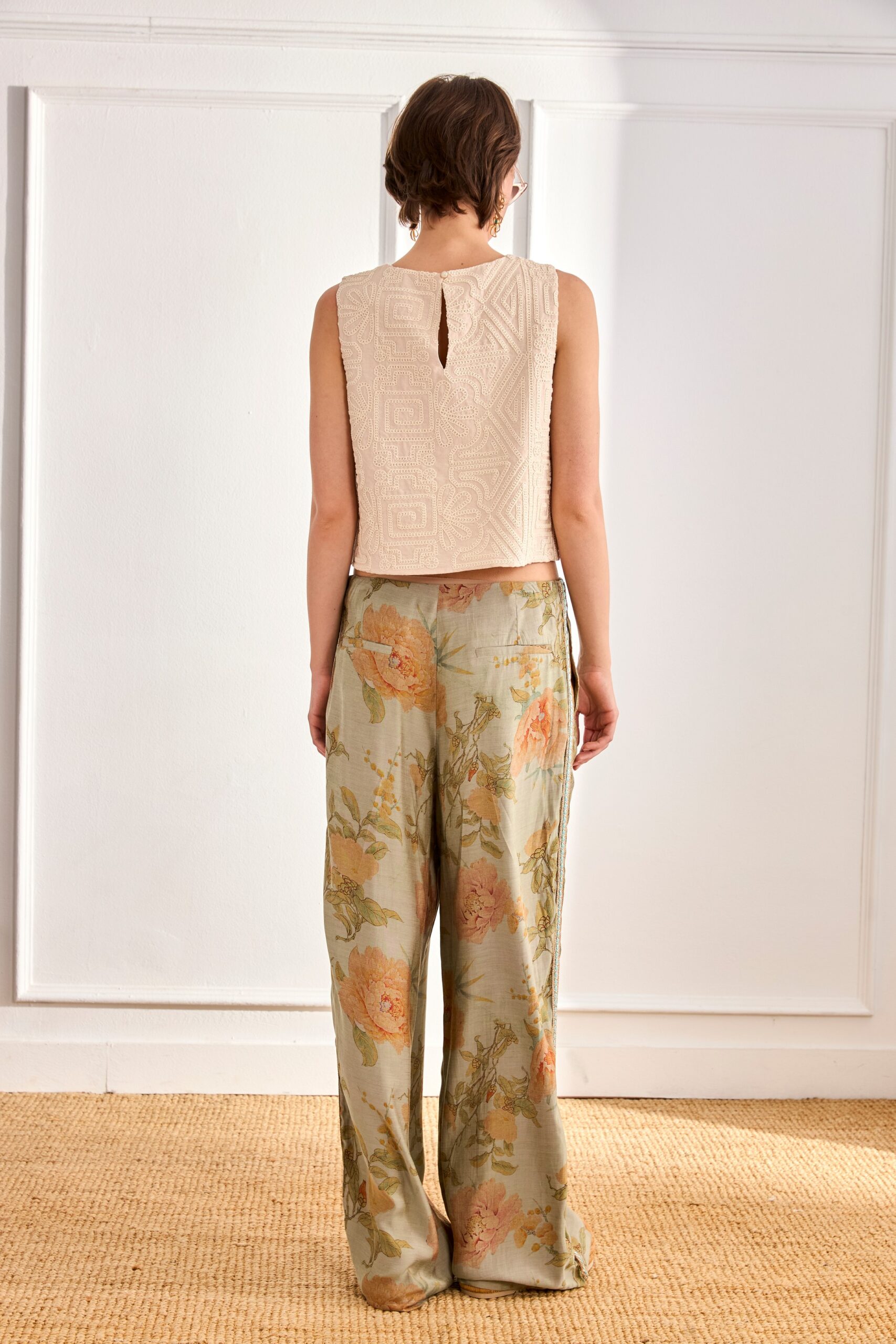 Pantalón largo fluido en tejido fino estampado con flores. Detalle de pasamanería en las costuras exteriores. Bolsillos laterales y bolsillos de traje en la parte trasera.