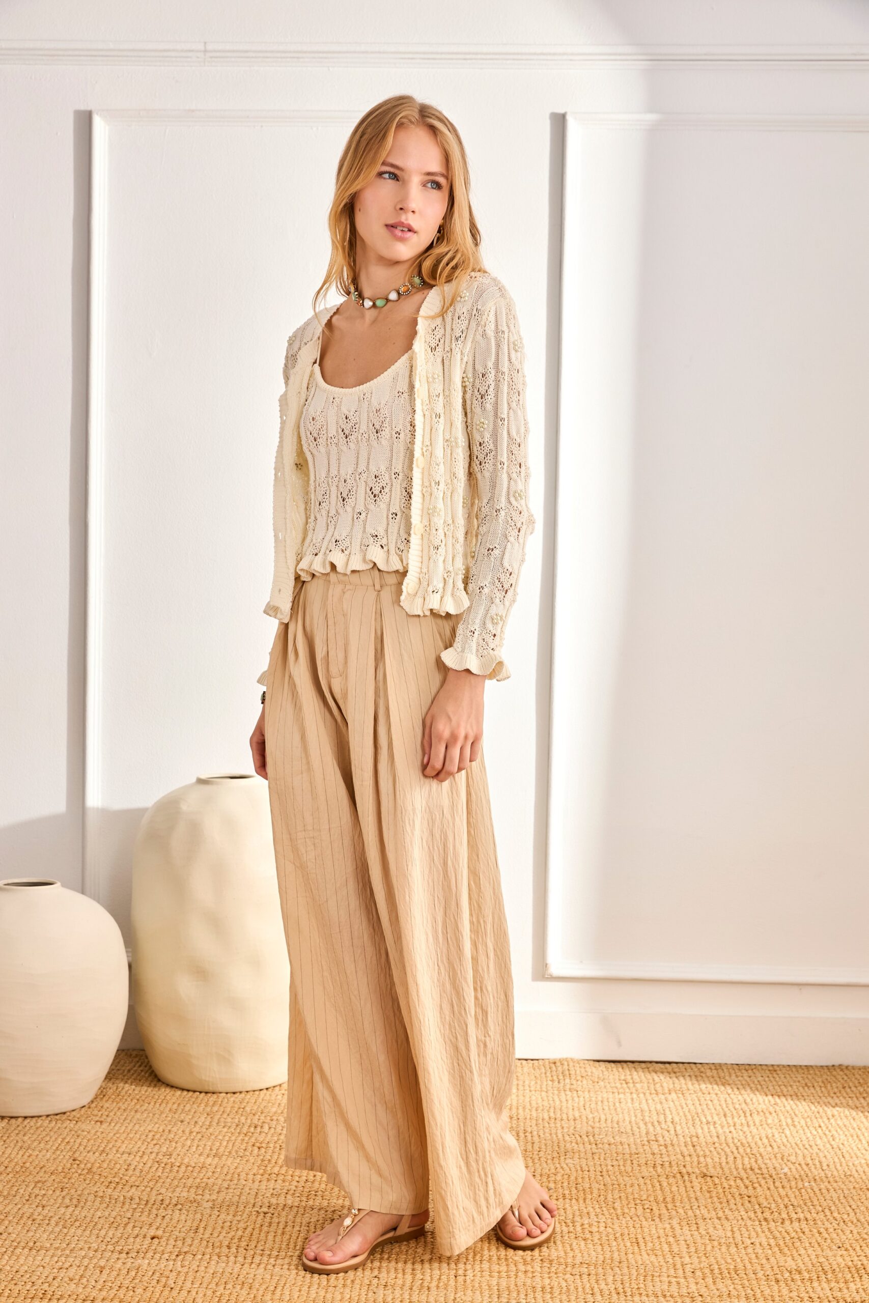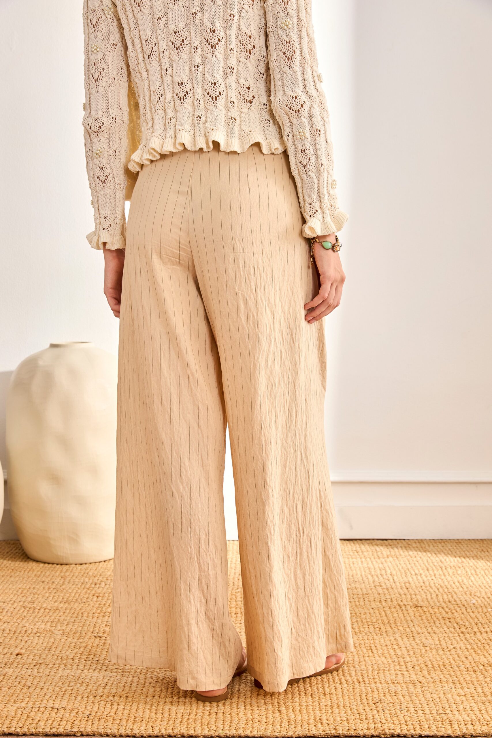 Pantalón largo en tejido fino estilo traje con pinzas y diseño ancho. Bolsillos laterales y cierre de botón y cremallera.