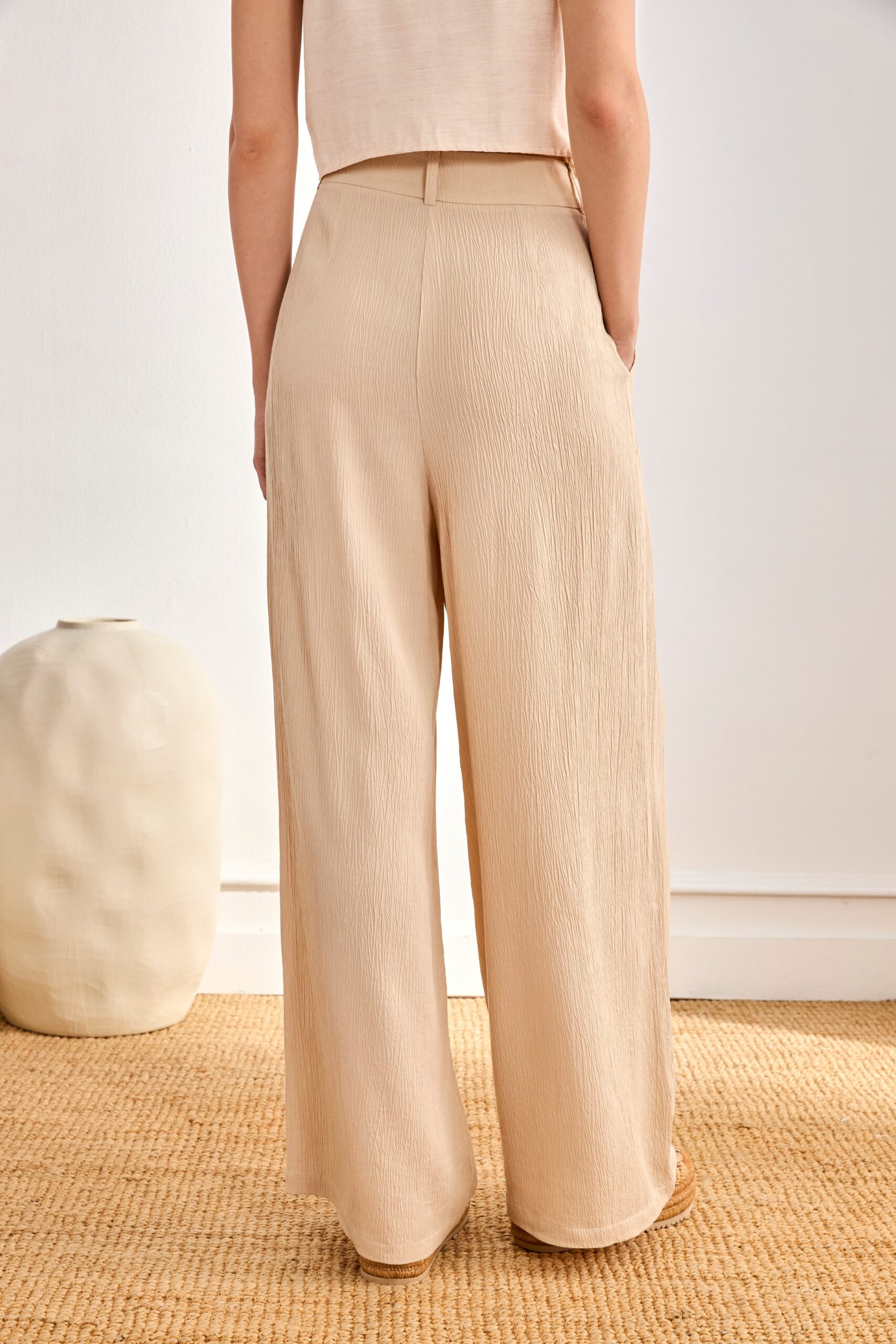 Pantalón largo en tejido efecto smoke con pinzas delanteras. Bolsillos laterales. Cierre oculto de presilla y cremallera.